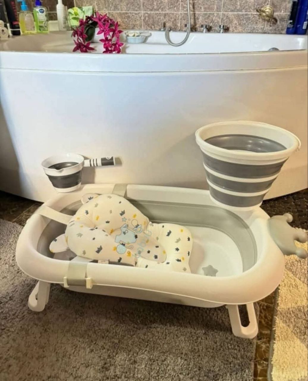 عرض البانيو السيليكون عباره عن بانيو بترمومتر ومعاه جردل ومعاه مغرفه ومعاه كرسي سيليكون مناسب من عمر يوم لحد سنتين