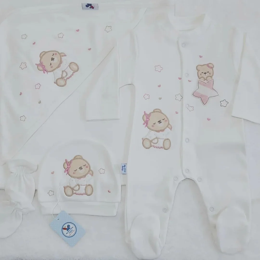طقم المستشفي اربع قطع للبيبي عباره عن سالوبت وكوفرته وكفوف وطاقيه الخامه قطن 100% معالج ضد الحساسيه مناسب للبيبي من اول مايتولد لحد ست شهور قطن صيفي مناسب من شهر تلاته لحد شهر تسعه