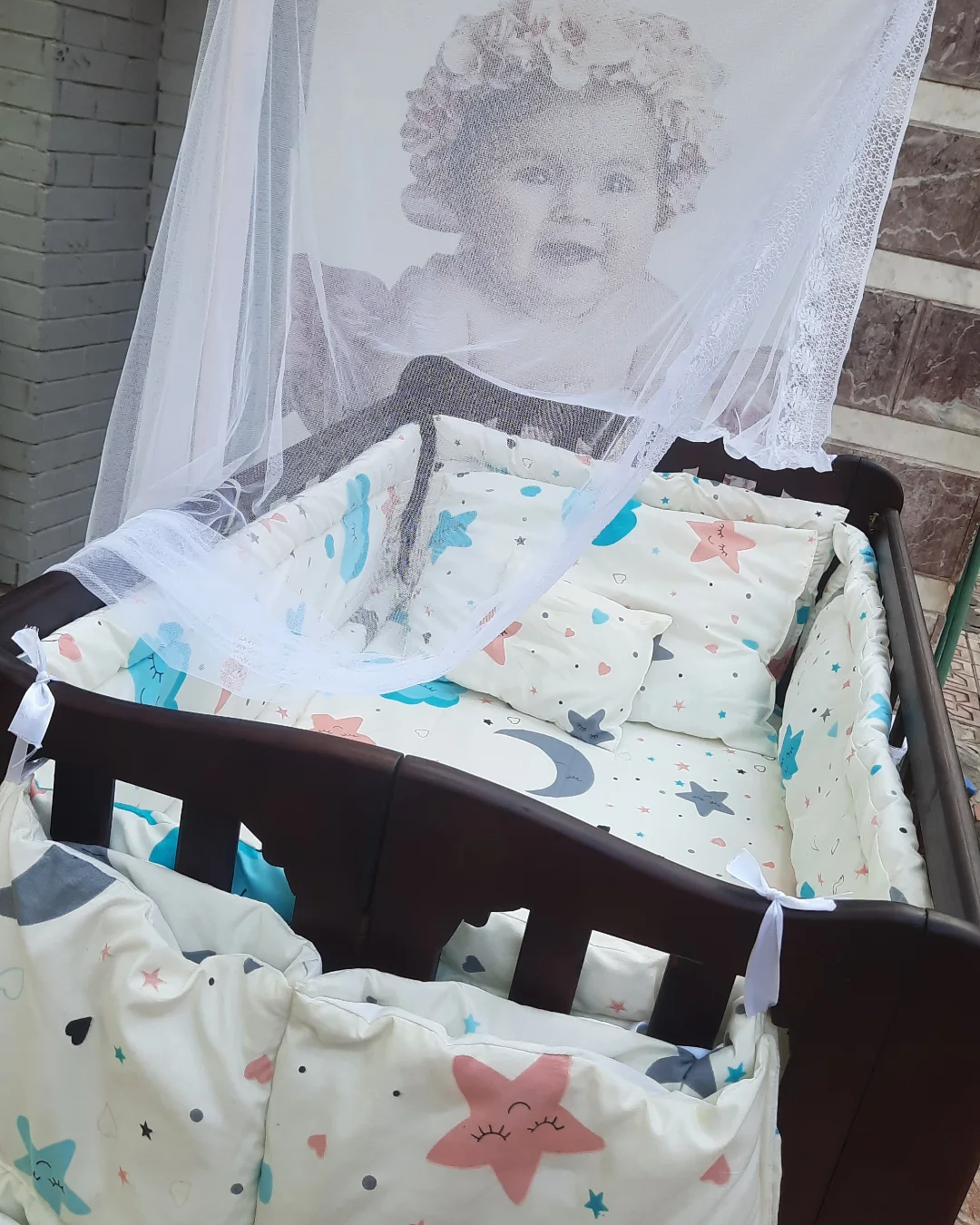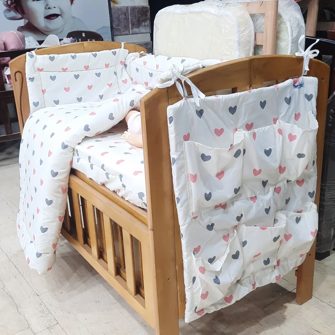 طقم فرش سرير البيبي عباره عن جوانب وملايه ومخده ولحاف ومنظم خامة القماش قطن وحشو فايبر متوسط الكثافه مناسب للسرير ال 120 في 70 ومتوفر الوان اولادي وبناتي متاح فيديو لشرح المنتج اطلبو المساعده في اي وقت من خلال الضغط علي ايقونة الواتساب في الموقع هنرد عليكم في اي وقت