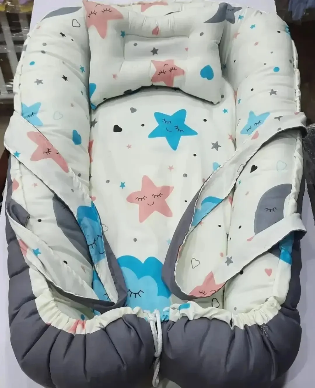 البيبي نيست عباره عن سرير متنقل مذود بدعامه خشب لدعم ضهر البيبي ومبطن بالفايبر عالي الكثافه وخامة القماش قطن بيسهل عليكي التنقل بالبيبي داخل البيت وبيحمي البيبي من الوقوع المتكرر من السرير وليه يد بيتشال منها وليه سوسته عشان لو حبيتي تغسليه وليه ناموسيه تحمي البيبي من الحشرات