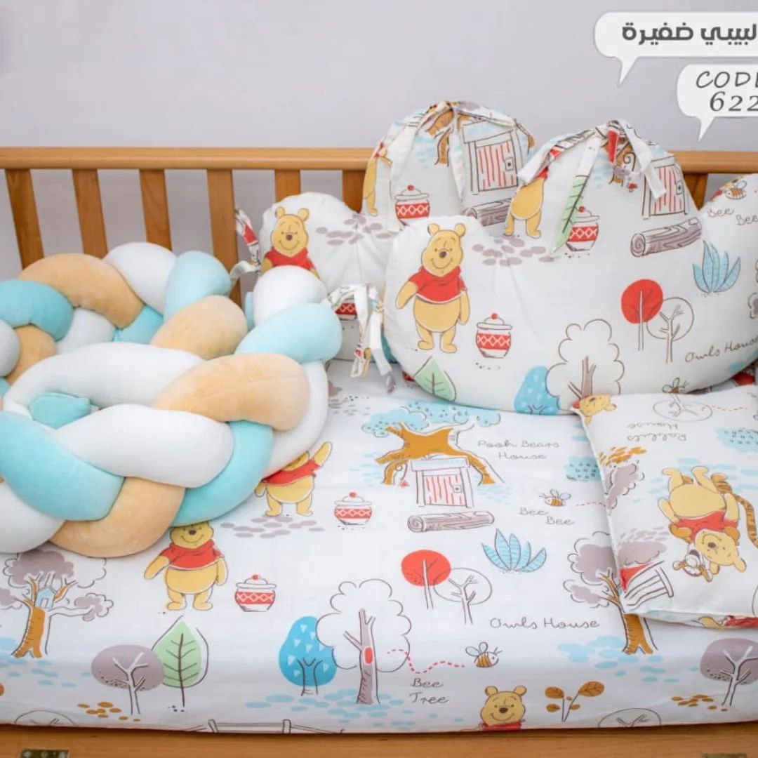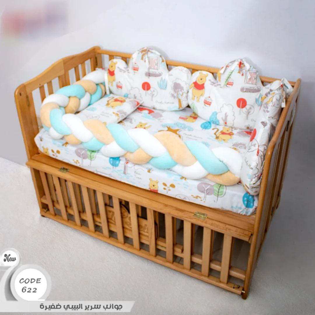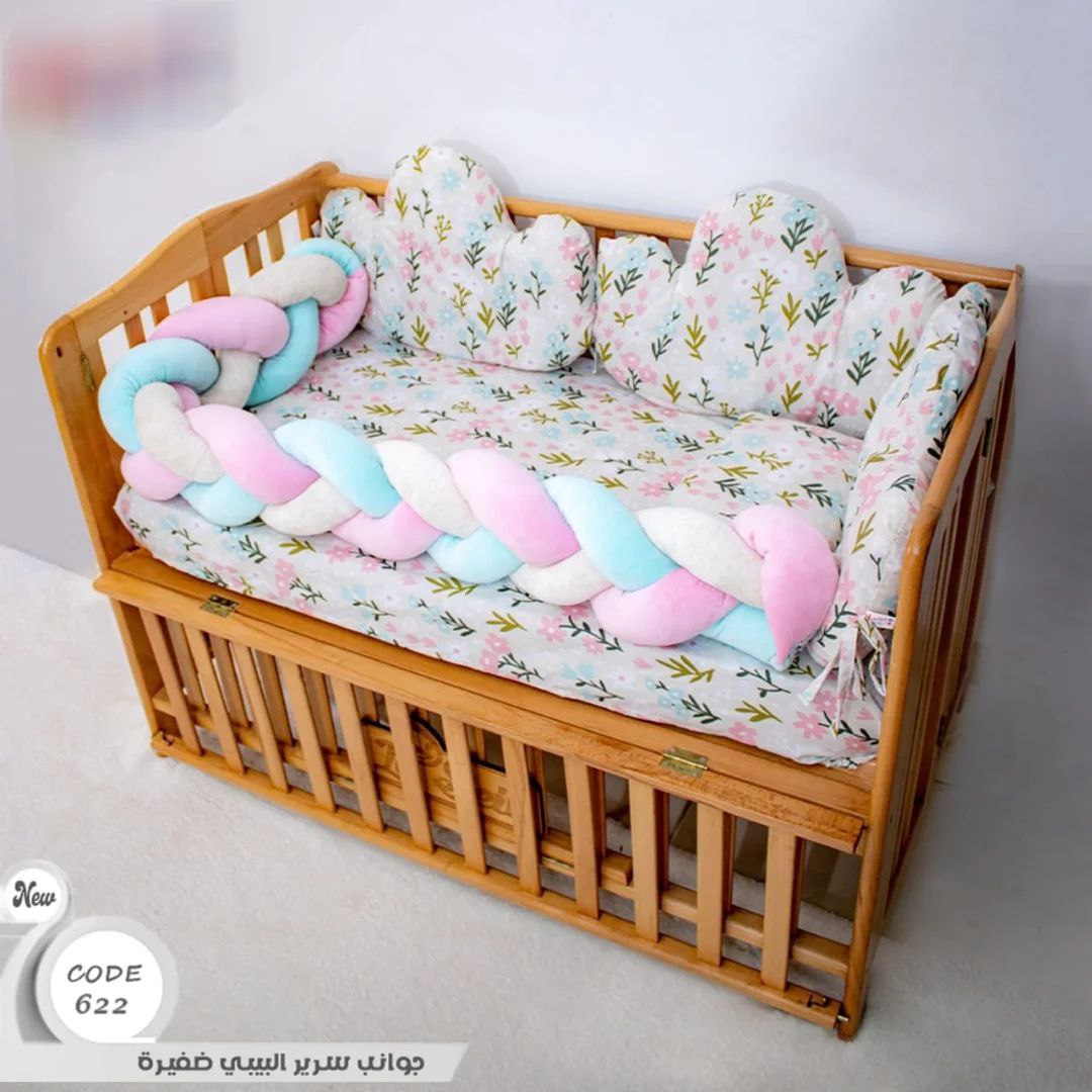 الجوانب الضفيره طقم 6 قطع عباره عن ملايه واتنين مخده سحابه ومخده مستطيله ومنظم وضفيره الخامه قطن 100% مناسبه لجميع مقاسات سراير البيبي متوفره بألوان مبهجه