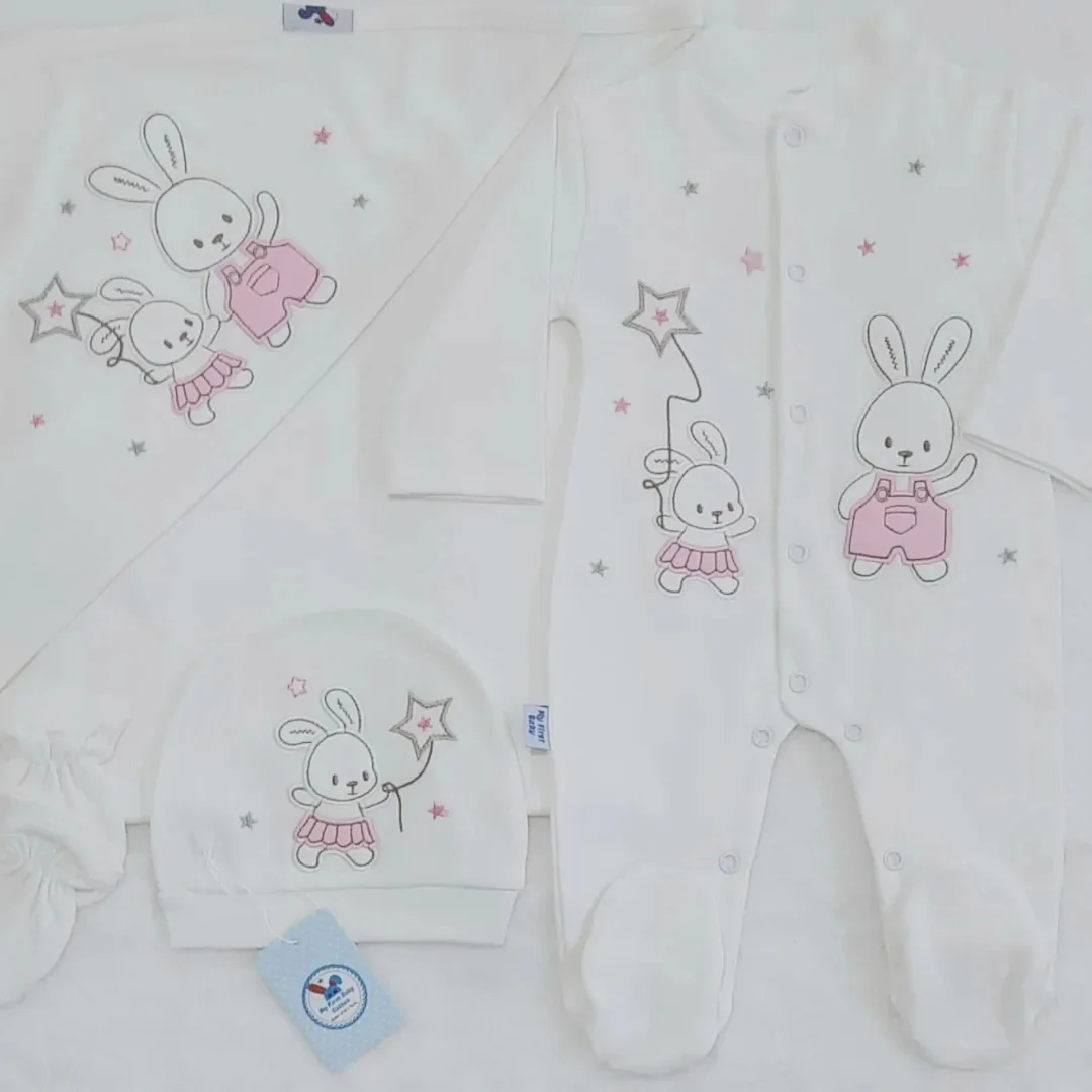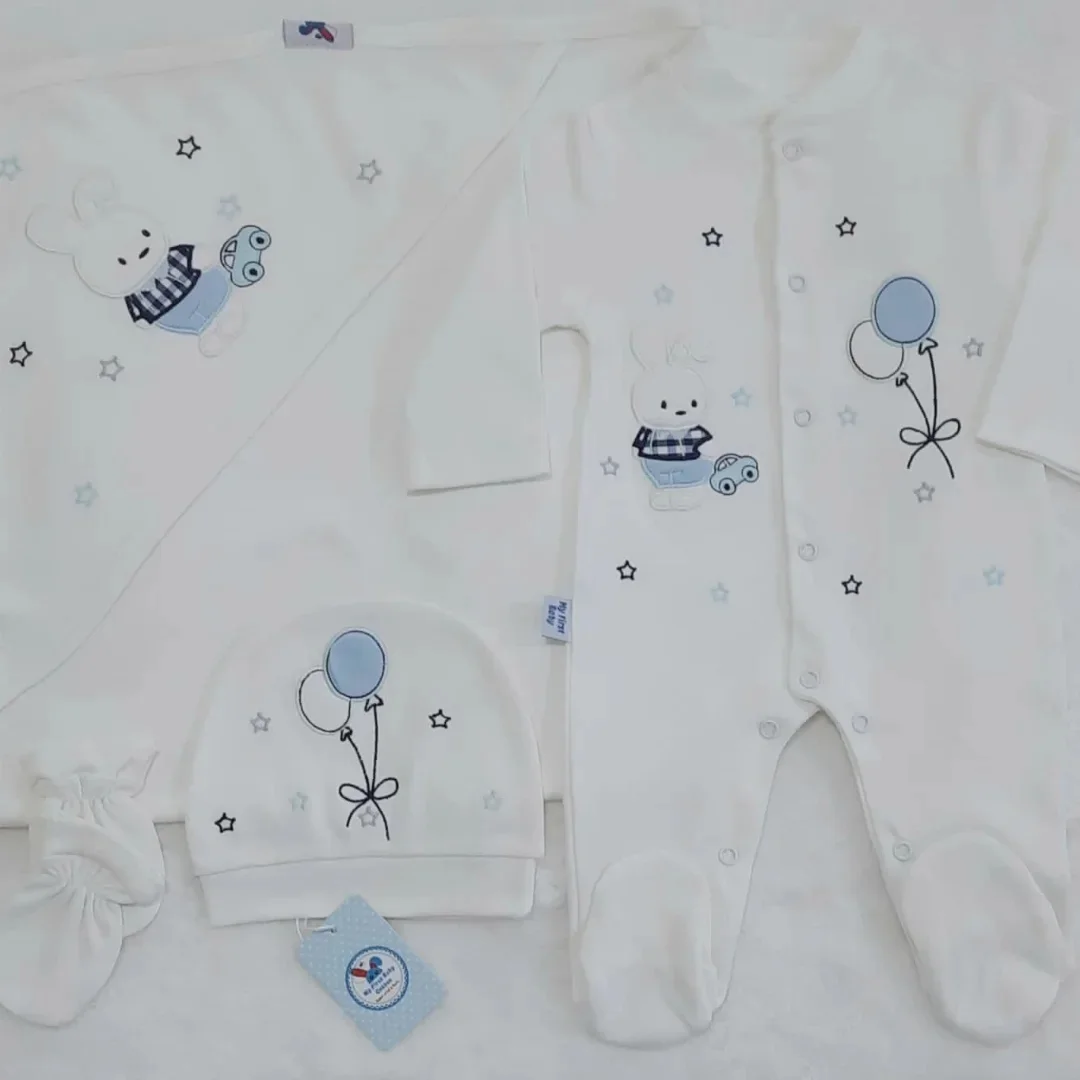 طقم المستشفي اربع قطع للبيبي عباره عن سالوبت وكوفرته وكفوف وطاقيه الخامه قطن 100% معالج ضد الحساسيه مناسب للبيبي من اول مايتولد لحد ست شهور قطن صيفي مناسب من شهر تلاته لحد شهر تسعه