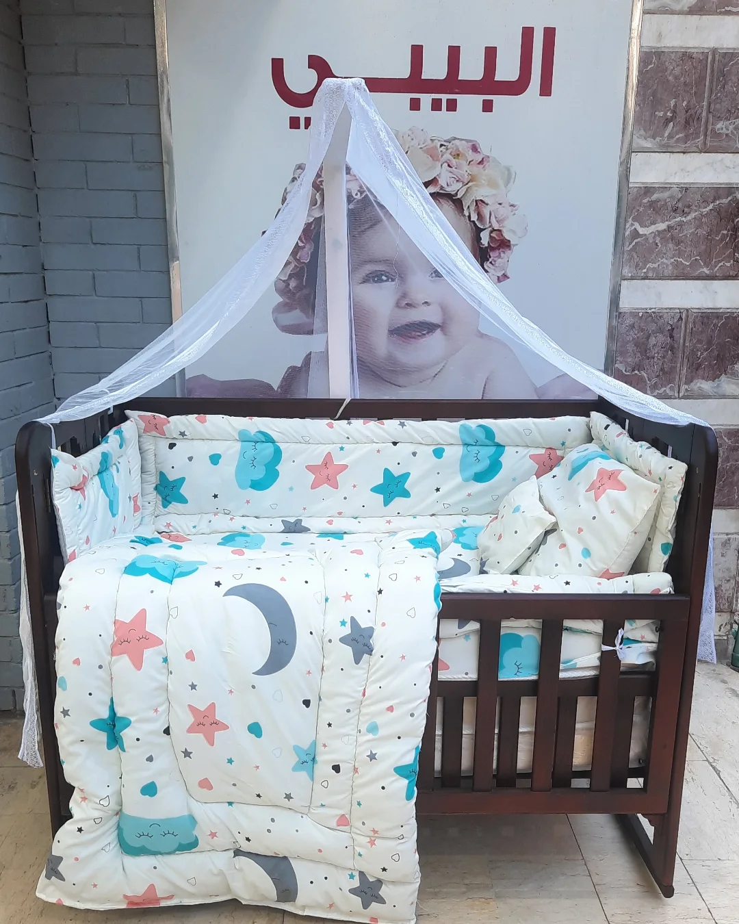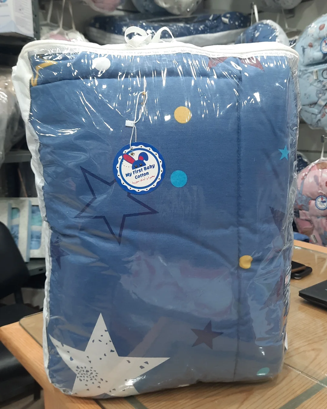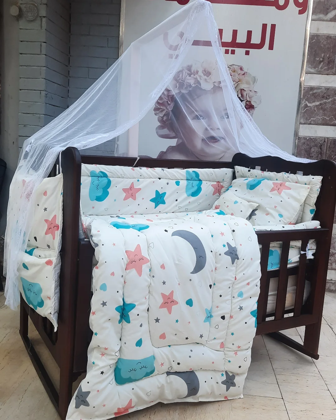 طقم فرش سرير البيبي عباره عن جوانب وملايه ومخده ولحاف ومنظم خامة القماش قطن وحشو فايبر متوسط الكثافه مناسب للسرير ال 120 في 70 ومتوفر الوان اولادي وبناتي متاح فيديو لشرح المنتج اطلبو المساعده في اي وقت من خلال الضغط علي ايقونة الواتساب في الموقع هنرد عليكم في اي وقت