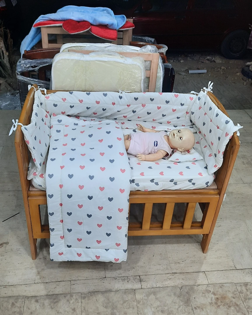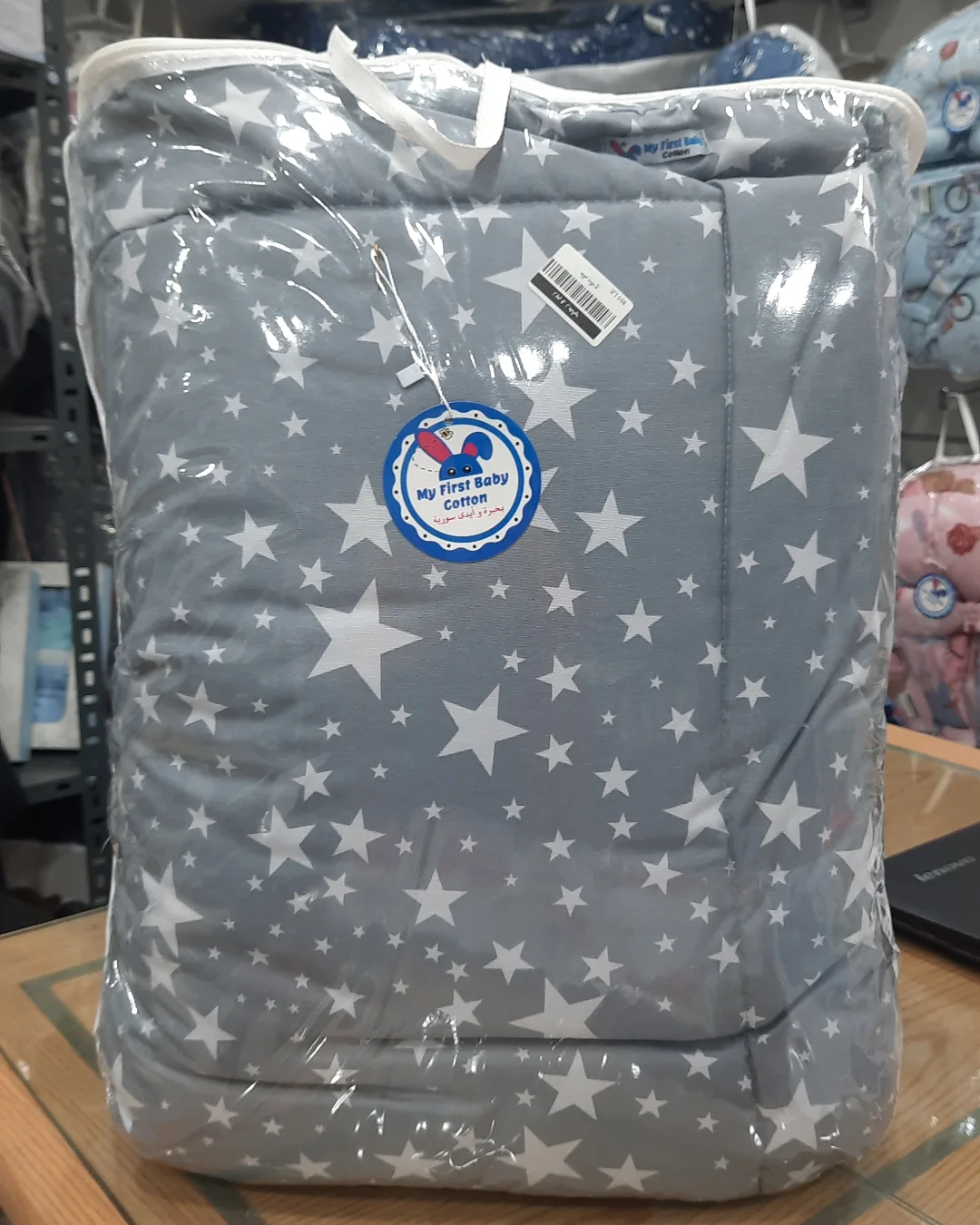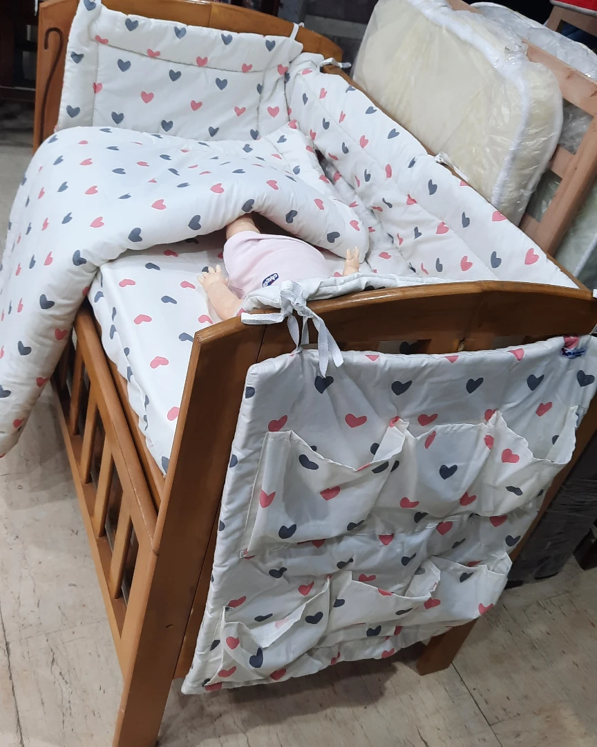 طقم فرش سرير البيبي عباره عن جوانب وملايه ومخده ولحاف ومنظم خامة القماش قطن وحشو فايبر متوسط الكثافه مناسب للسرير ال 120 في 70 ومتوفر الوان اولادي وبناتي متاح فيديو لشرح المنتج اطلبو المساعده في اي وقت من خلال الضغط علي ايقونة الواتساب في الموقع هنرد عليكم في اي وقت