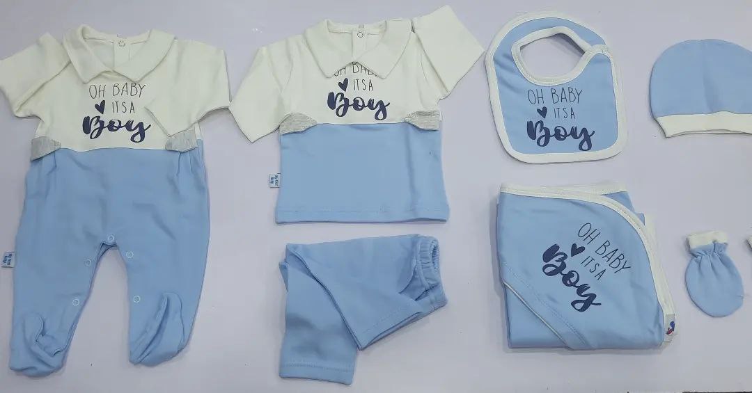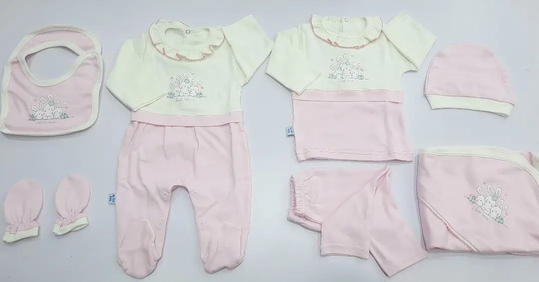 طقم المستشفي سبع قطع عباره عن سالوبت وبيجامه وكوفرته وطاقيه وكفوف قطن بيور معالج ضد الحساسيه وطباعه ثابته بيلبس من مواليد لحد ست شهور متوفر منه اولادي وبناتي ومتوفر كمان اربع قطع ومتوفر سالوبت فرداني وبيجامه فرداني